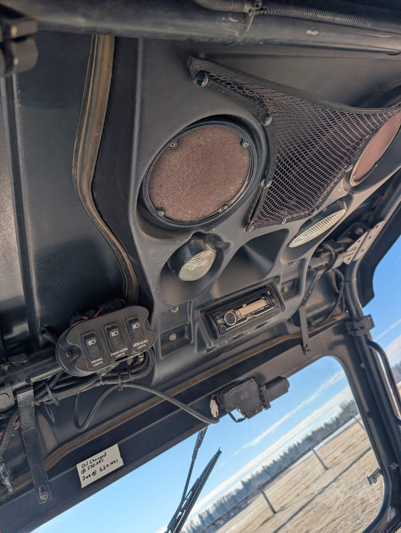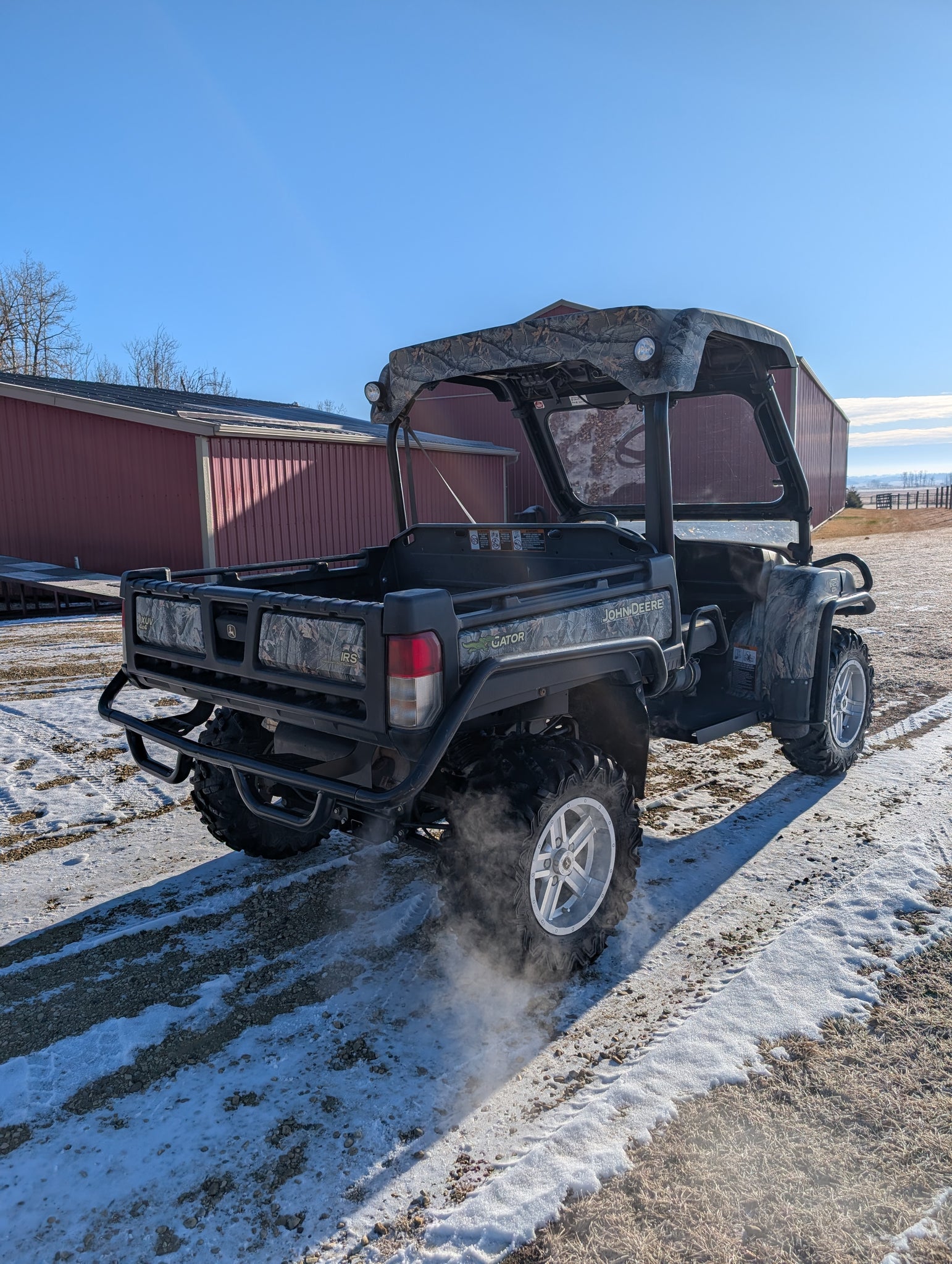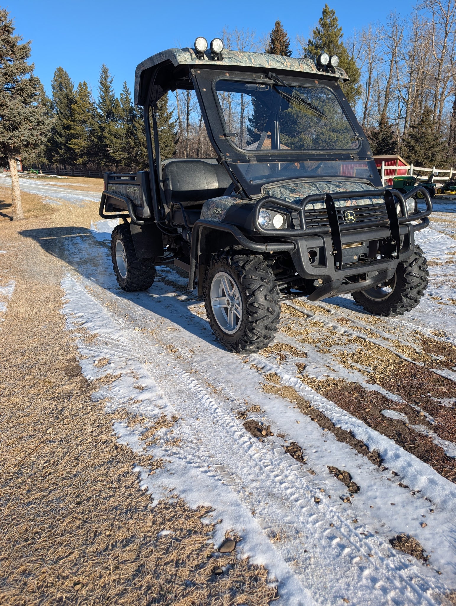 John Deere 2012 825I gator with 50hp 3 cylinder liquid cooled gas engine, top speed is 44mph. This unit only has 583hrs and 2700 miles. Has electric lift dump box, speakers and stereo setup on roof of cab, also wiring harnesses and switches for winch. Also has glass windshield and aluminum rims.