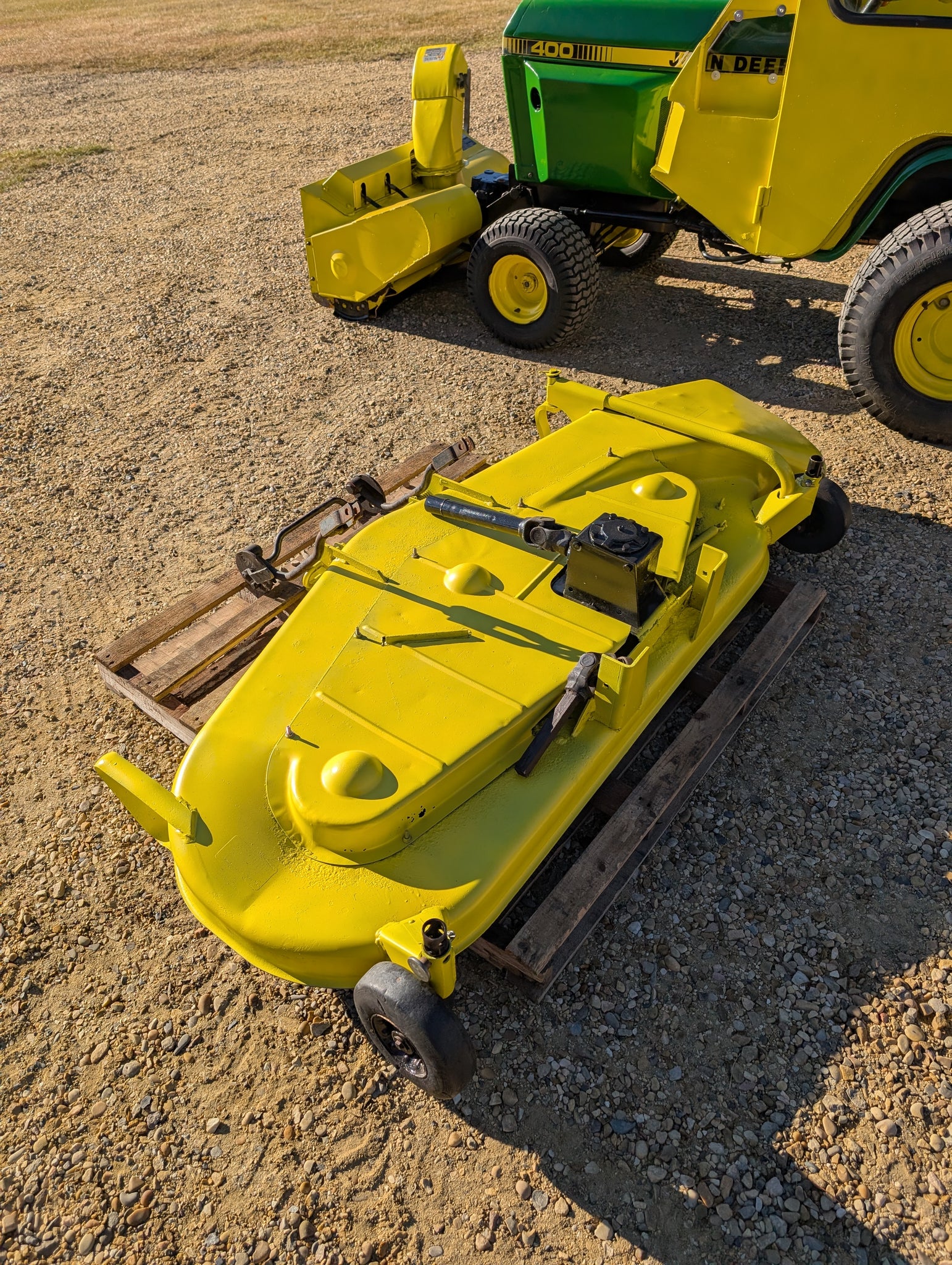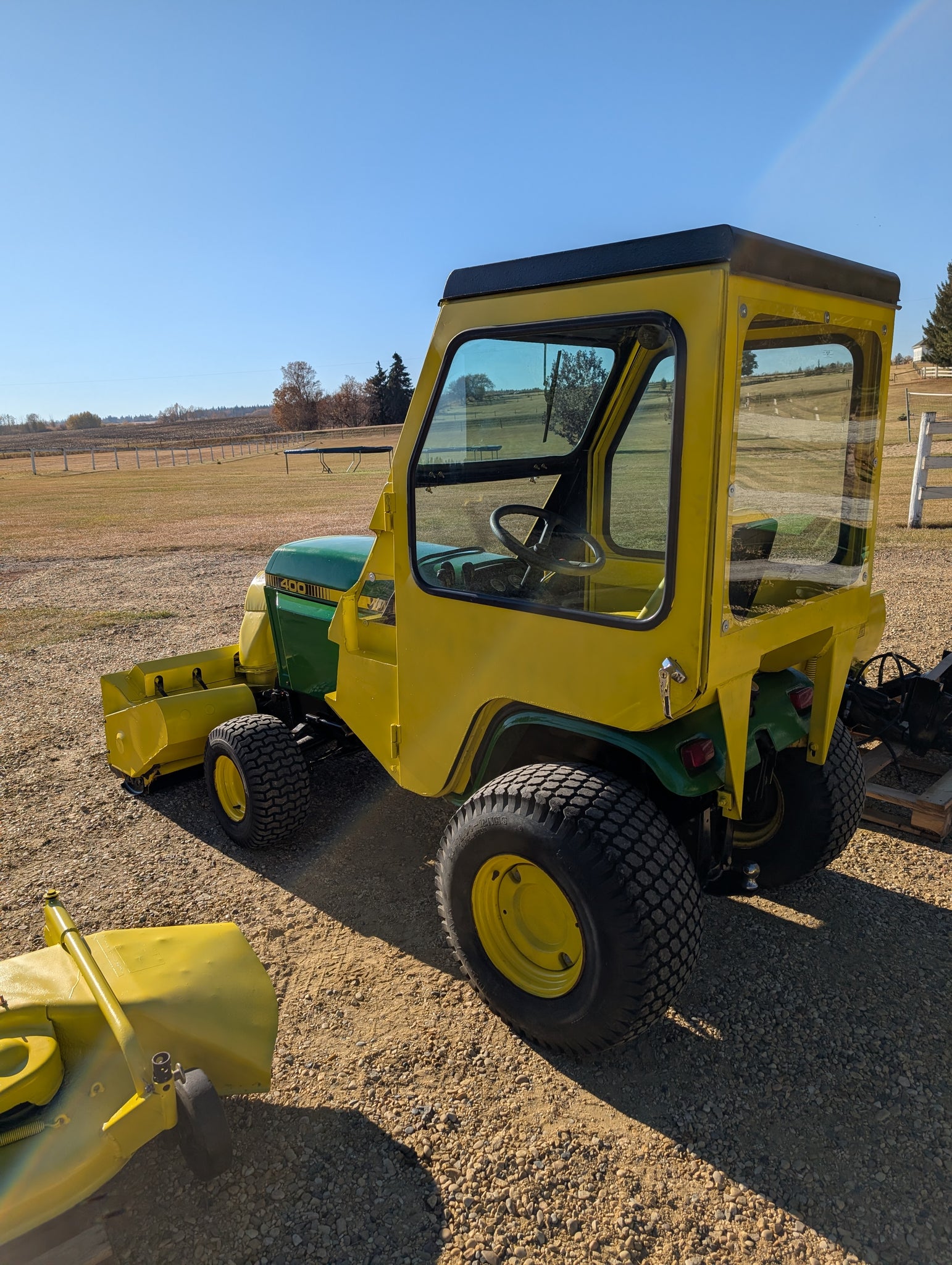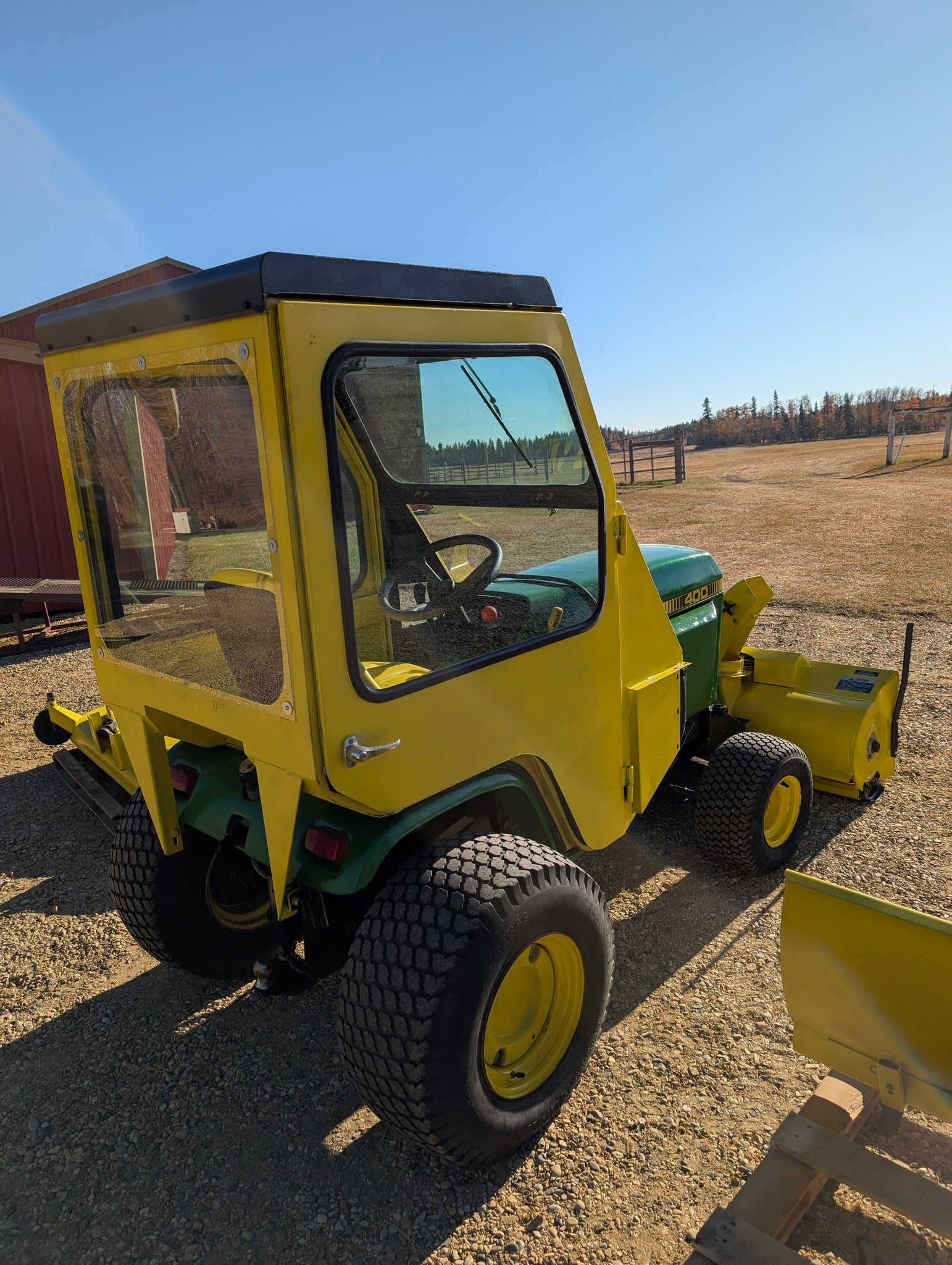 Up for sale the John Deere 400 with Kohler gas engine 20HP with hydrostatic transmission with 1428hrs. Also has hydraulic lift for implements and front hydraulic aux for front implements. This package includes Cab, 46" single stage snowblower, 60" belly mowing deck, Dual hydraulic cylinder blade. Available for extra rototiller+gearbox+3 point hitch $3000